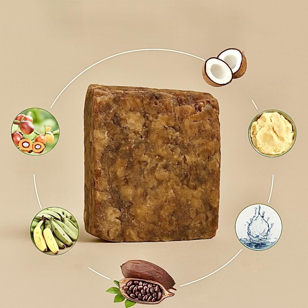 الصابون الأسود الأفريقي الأصلي، مستورد خصيصًا من غرب أفريقيا (ألاتا سامينا)، مصنوع يدويًا من قشور الكاكاو، جلود الموز، زيت النخيل، وزيت جوز الهند.